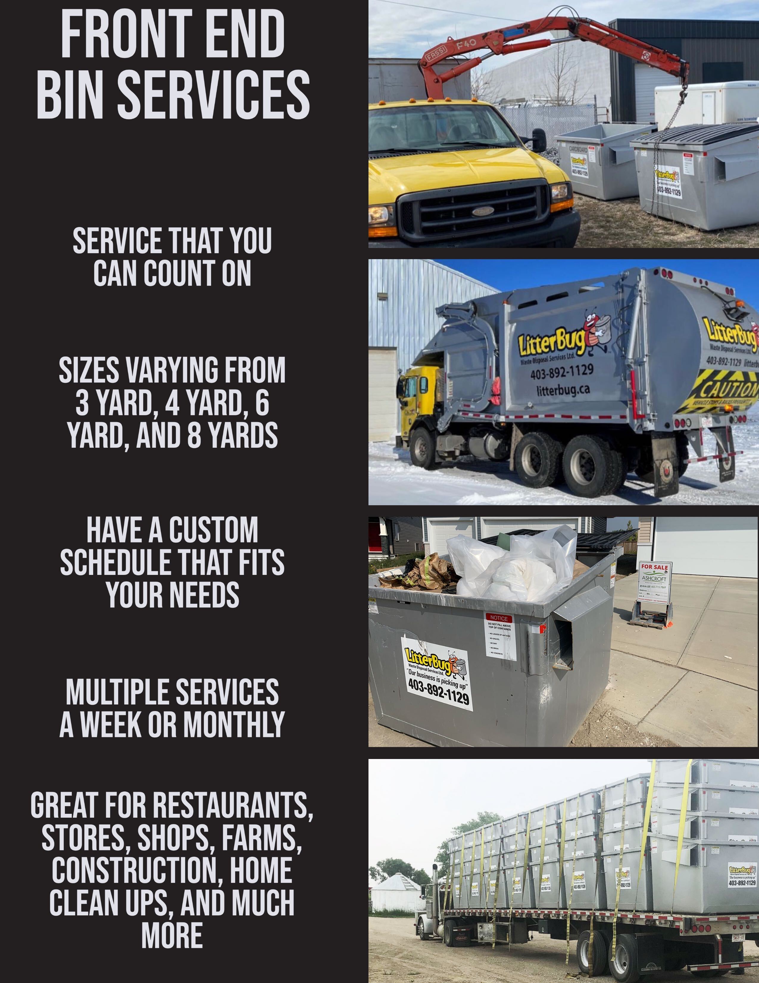 Our front load bin service is highly flexible. We can schedule pickups daily, weekly, bi-weekly, or on a custom schedule that fits your business or site needs. You can also adjust pickup frequency seasonally or as your waste volume changes.